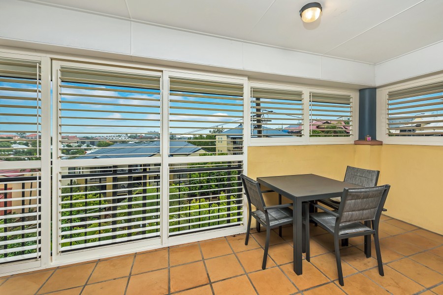 The living area provides excellent space with high ceilings, ducted air conditioning and glass sliding doors that lead out to the balcony fitted with privacy screen shutters.